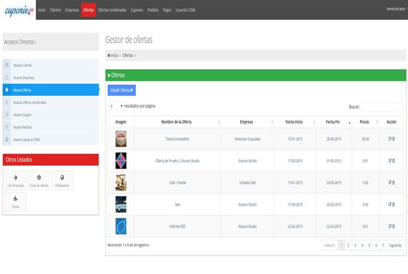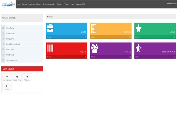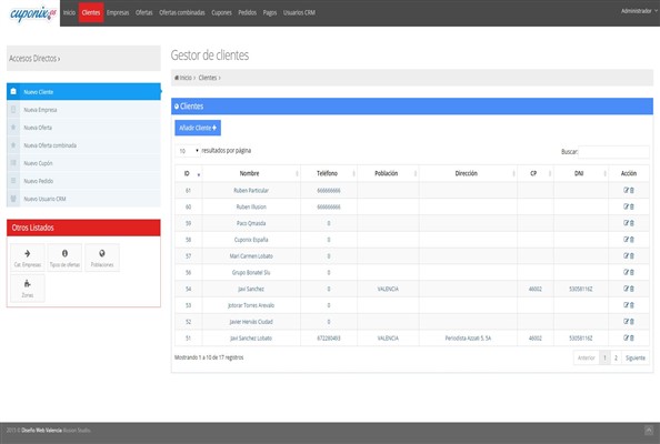 Desarrollo a medida para la empresa Cuponix de Valencia. Este CRM permite gestionar la información del usuario registrado y las ofertas que tienen. Además, podrá utilizar gestionar ofertas combinadas, cupones y clientes.